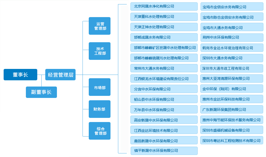 深圳金達(dá)環(huán)境科技控股有限公司下設(shè)運營管理部、技術(shù)工程部、市場部、財務(wù)部、綜合管理部等5個部門,成員企業(yè)有: